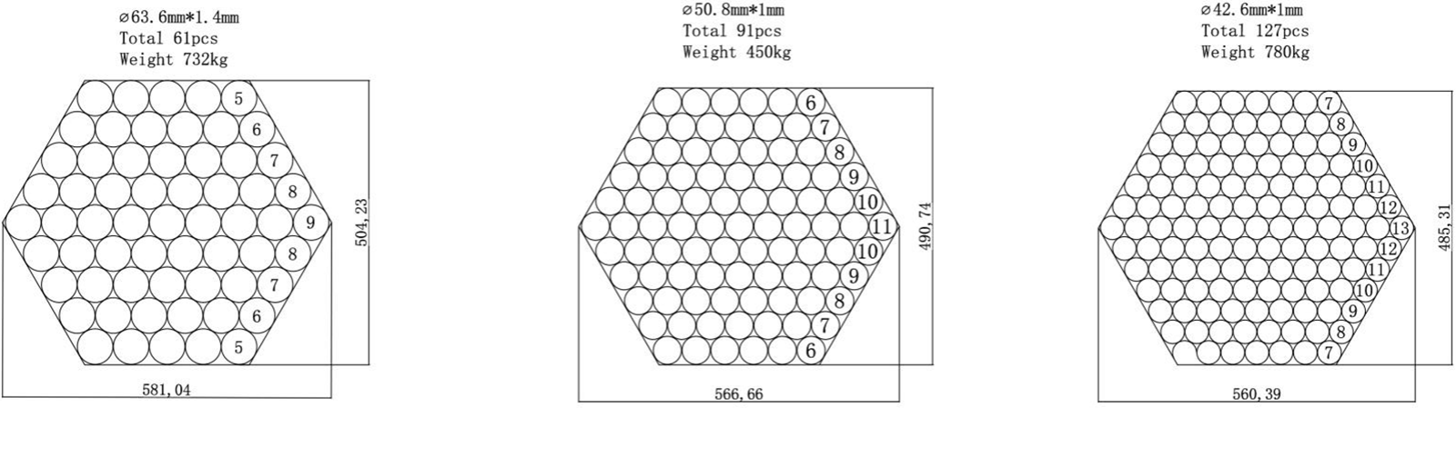 S.NO | Tube diameter(mm) | Total tube number of bundle (pcs) | Tube number in the inner-most layer of bundle (pcs) | Bundle width (mm) | Bundle height (mm) | Bundle size(mm) |